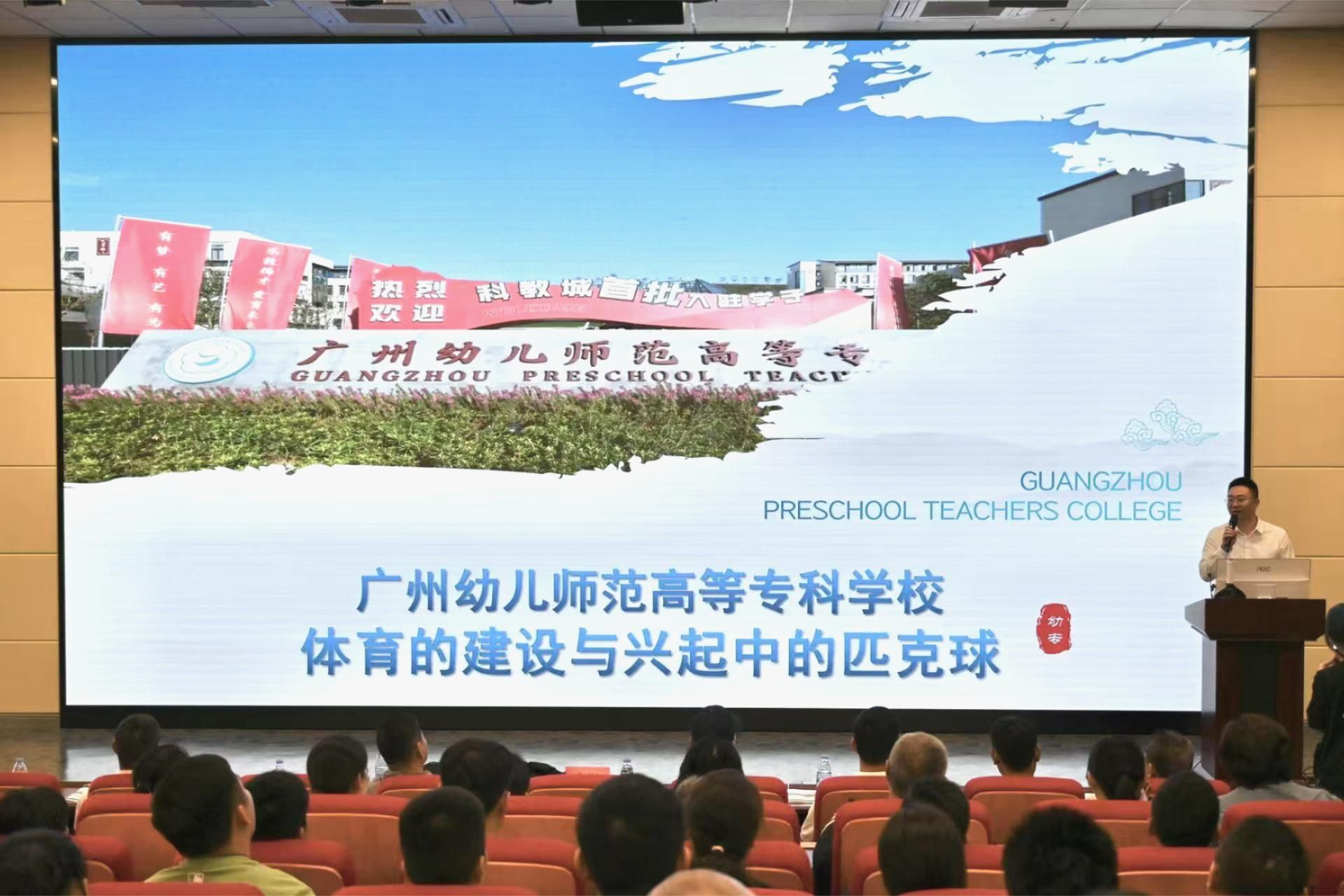 图为副校长龙辉针对校园足球👨🏻💼♒️、匹克球运动的基本规则与校园推广思路进行主题发言