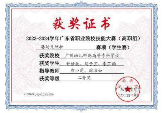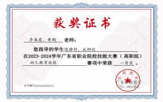 教师取得多项专业成果🩵,指导学生获广东省高职院校学前教育专业学生技能大赛一等奖🎖、2023 - 2024 学年广东省职业院校技能大赛(高职组)婴幼儿照护赛项(学生赛)二等奖🕜、广东省职业院校技能大赛二等奖、广东省职业院校技能大赛婴幼儿健康养育照护赛项三等奖。